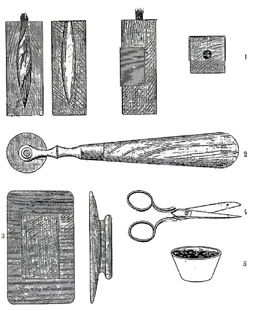I, Moule à cigares dans ses différentes positions. — 2, Molette tranchante pour couper les feuilles. — 3, Polissoir. — 4, Ciseaux à façonner les pointes de cigares. — 5, Pot à colle.
