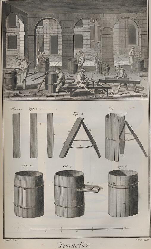 Tonnelier au XVIIIe siècle – Photo extraite de L’Encyclopédie ou Dictionnaire raisonné des sciences, des arts et des métiers est une encyclopédie française Diderot – d’Alembert