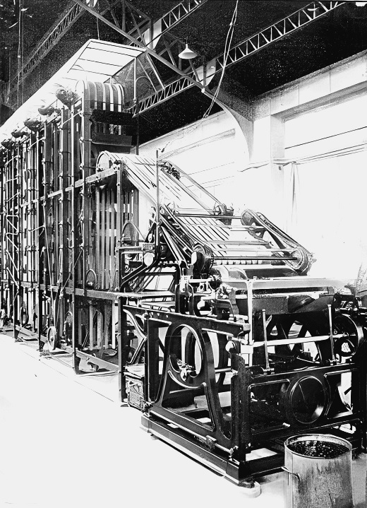 Se trouve aussi l’atelier du clichage qui se fait par les procédés usités partout et qui n’offrent par conséquent aucune particularité; l’atelier des réparations mécaniques ; l’atelier du lavage des rouleaux; la salle de « coulerie » des rouleaux ; puis les deux machines qui actionnent : l’une les ateliers des timbres, l’autre les ateliers du télégraphe. Elle ont chacune une puissance de 150 chevaux. Tous les monte-charges sont protégés; ils sont dans des cages fermées à clef et qu’un homme garde ; toutes les machines sont garanties par un voile de fil de fer; et toutes les transmissions sont dissimulées en terre ou sous les plafonds.