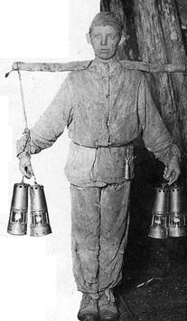 Le petit trapper est éveillé par sa mère à deux heures du malin; il se lève et se rend en toute hâte à la mine, emportant ordinairement pour sa nourriture de la journée un morceau de pain et du café dans une bouteille d’étain.