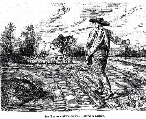Il y a trois manières de distribuer la semence sur le sol: à la volée, au plantoir et au semoir. La première manière est encore la plus répandue pour les céréales, quoiqu’elle ne soit pas la meilleure, tant s en faut; mais c’est celle que l’on a pratiquée de tout temps, dans tous les pays. Le semeur porte la graine dans un sac ou dans un long tablier suspendu à son cou; s’il se sert d’un tablier, il en roule fortement l’extrémité inférieure autour de son bras gauche, et jette les poignées de semence devant lui en leur faisant décrire une demi-circonférence de droite à gauche. Le contraire a lieu s’il sème de la main gauche. C’est cette opération élémentaire