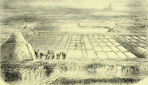 De la vasière, l’eau coule dans un étroit canal, appelé délivre, où. elle est promenée avant d’entrer dans les cobiers. Ceux-ci sont des carrés longs, séparés les uns des autres par de petites chaussées en glaise battue, qui s’élèvent seulement de quelques pouces au-dessus de l’eau; on leur donne le nom de ponts.